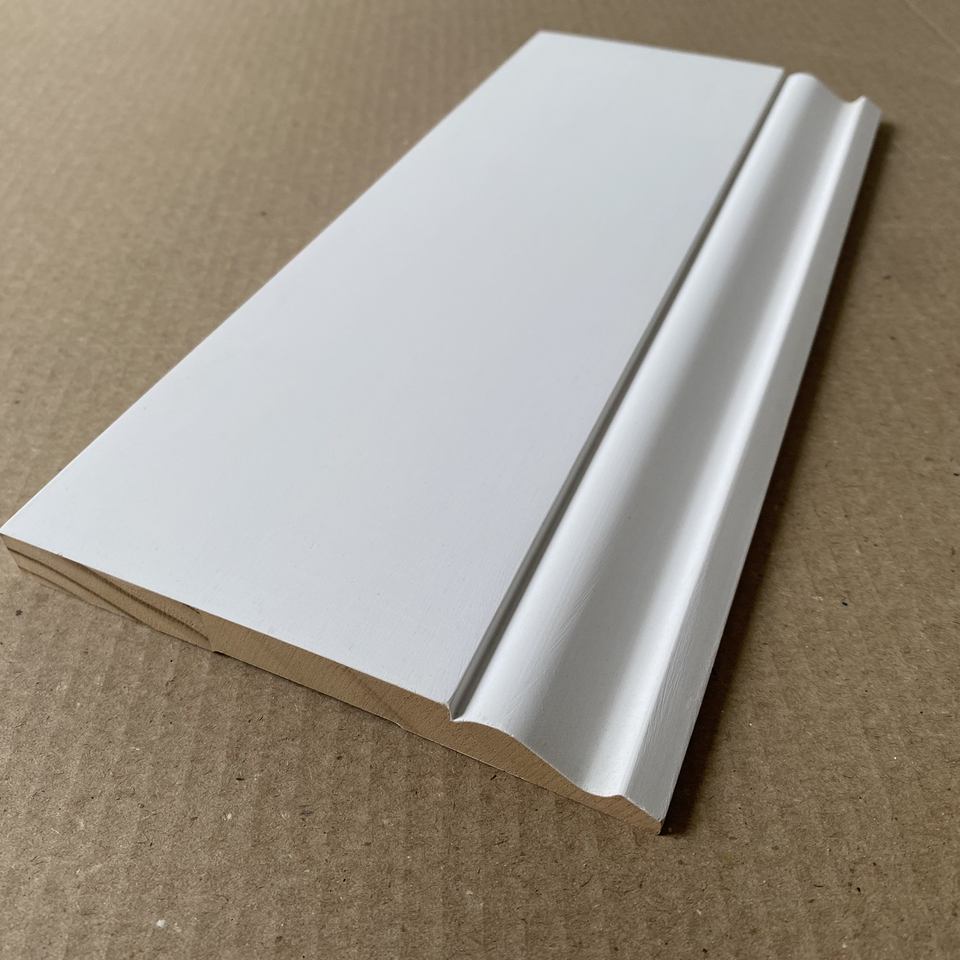 Plinthes et architraves en pin FJ à joints de doigt, apprêtées blanc
