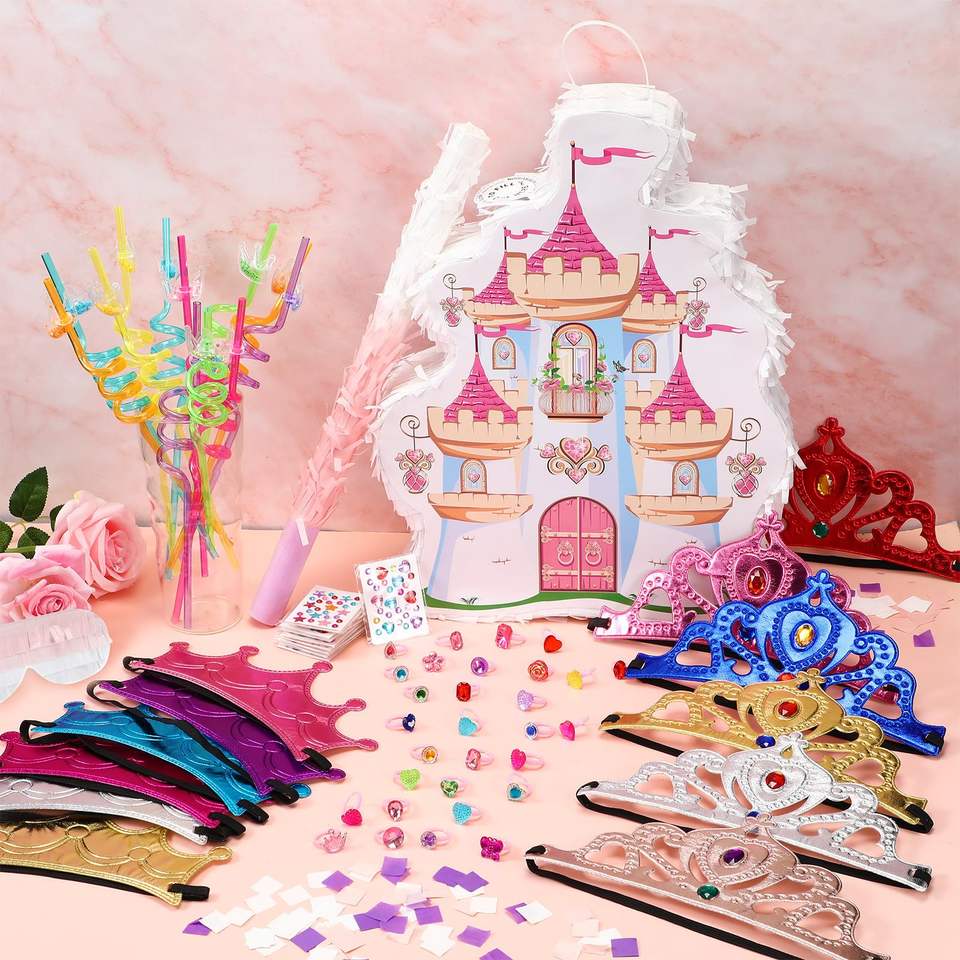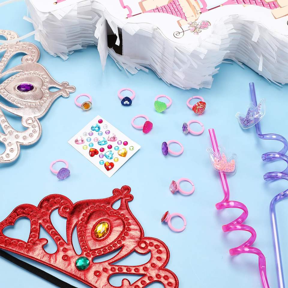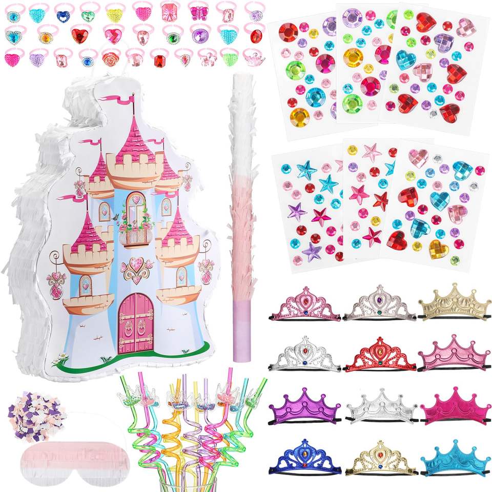 Princesse Château Pinata Diadèmes Couronne Bandeau Masque Gem Autocollants Gem Anneaux et Pailles Kit pour Thème Fête D'anniversaire Fournitures Décor