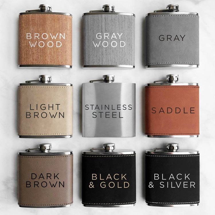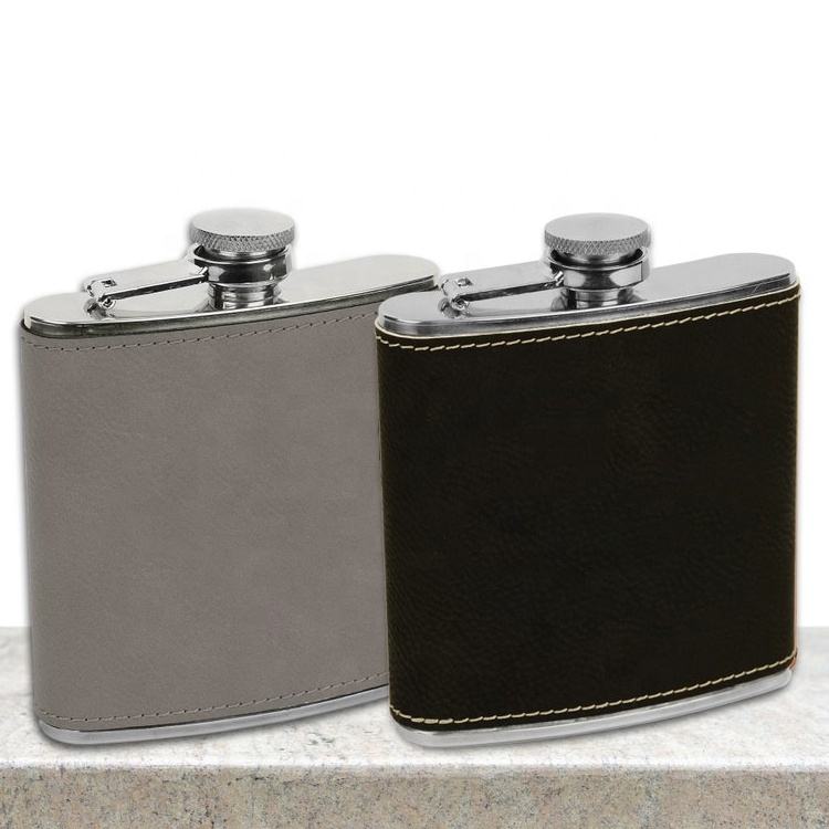 Flasque à alcool 6oz en acier inoxydable personnalisable au laser, avec étui en similicuir.