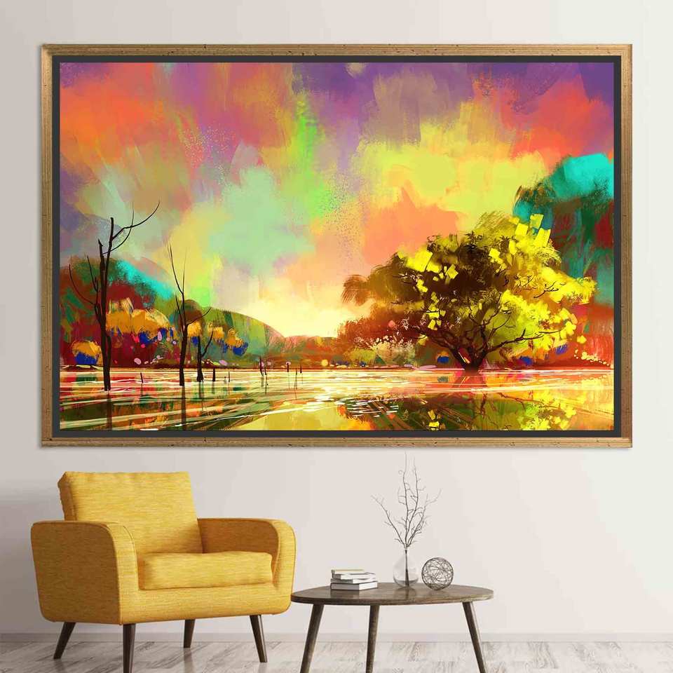 Tableau imprimé sur toile : Paysage d'automne avec arbres - Décoration saisonnière vibrante, toile encadrée dorée