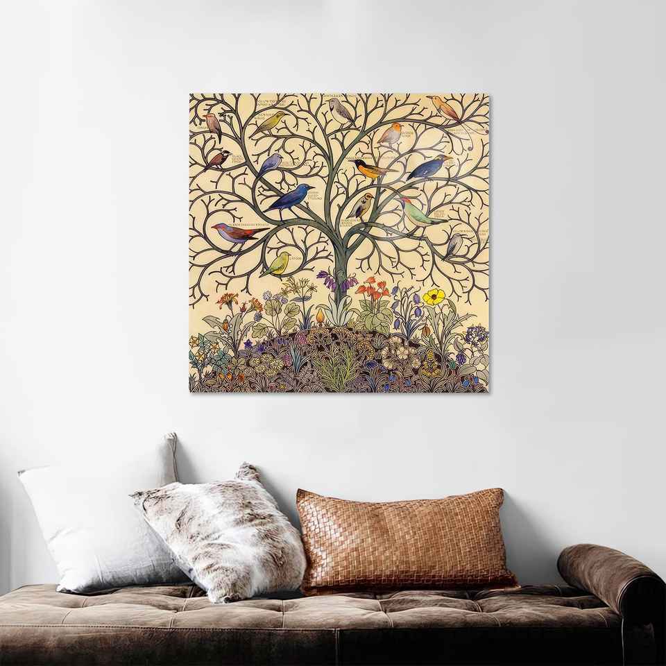 Toile imprimée : Oiseaux sur branches d'arbres et art floral, verre