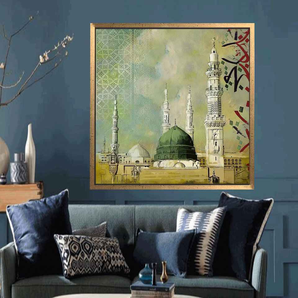 Toile imprimée : Œuvre d'art de la Mosquée du Prophète, Décoration élégante de la Masjid Nabawi, Encadrée en or