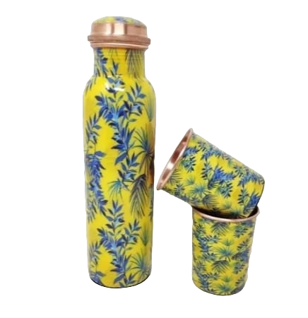 Vente en gros de bouteilles d'eau de gymnastique en cuivre imprimé, design martelé, verres en verre et plastique Avantages ayurvédiques