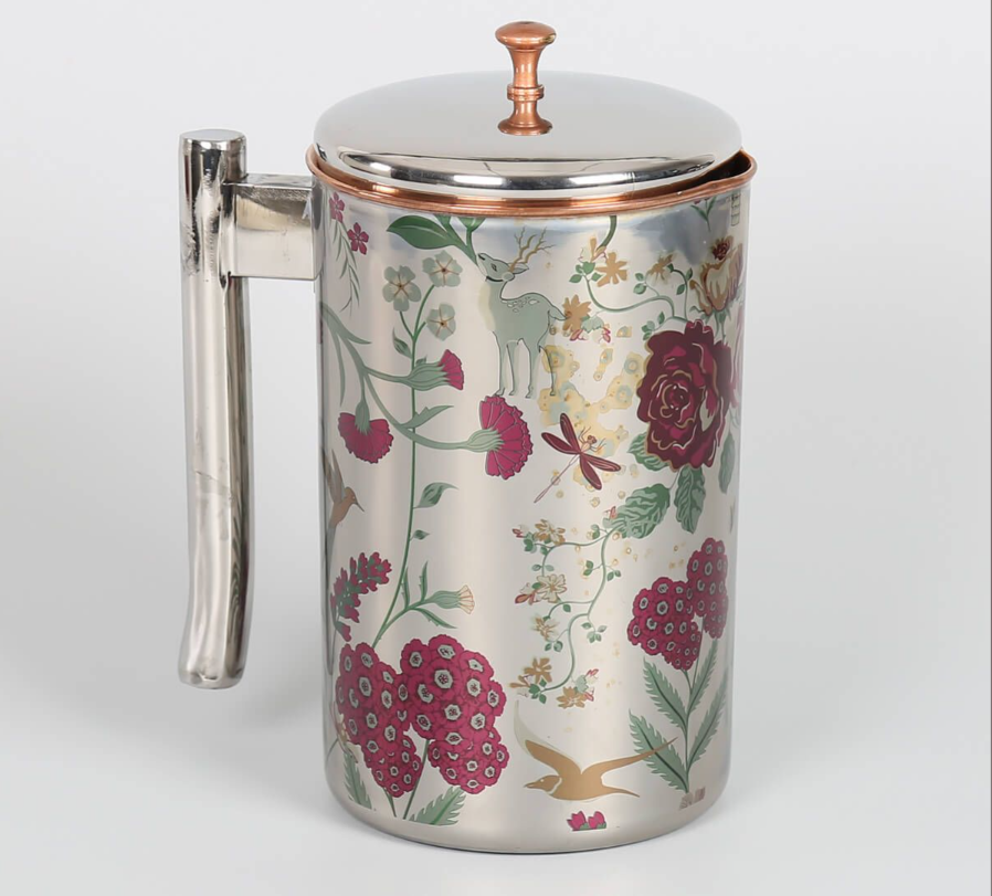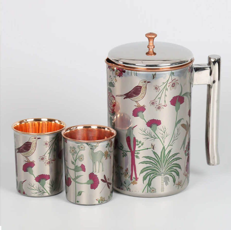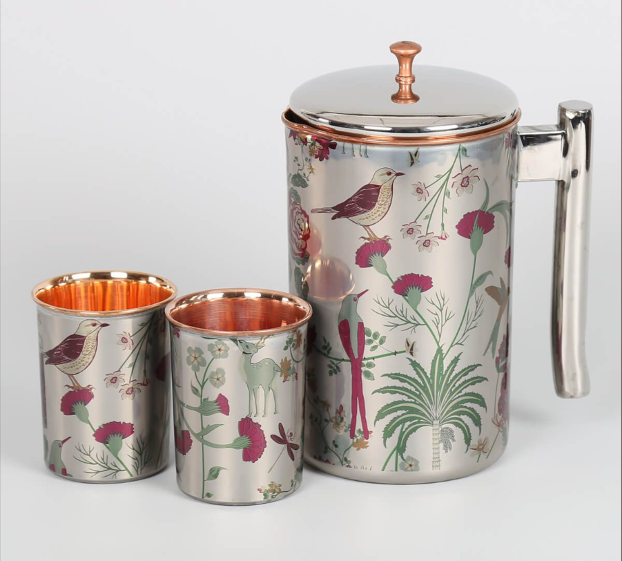 Cruche d'eau en cuivre de conception imprimée cruche d'eau en cuivre de haute qualité avec des verres pour la maison et le restaurant