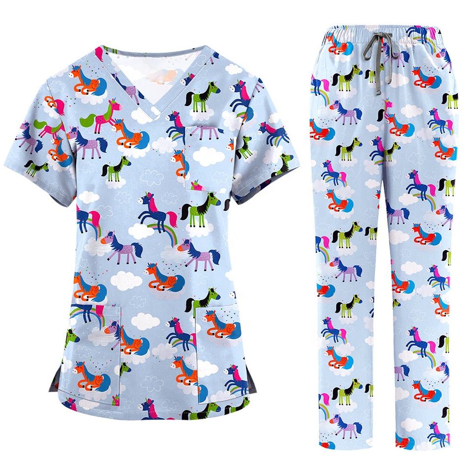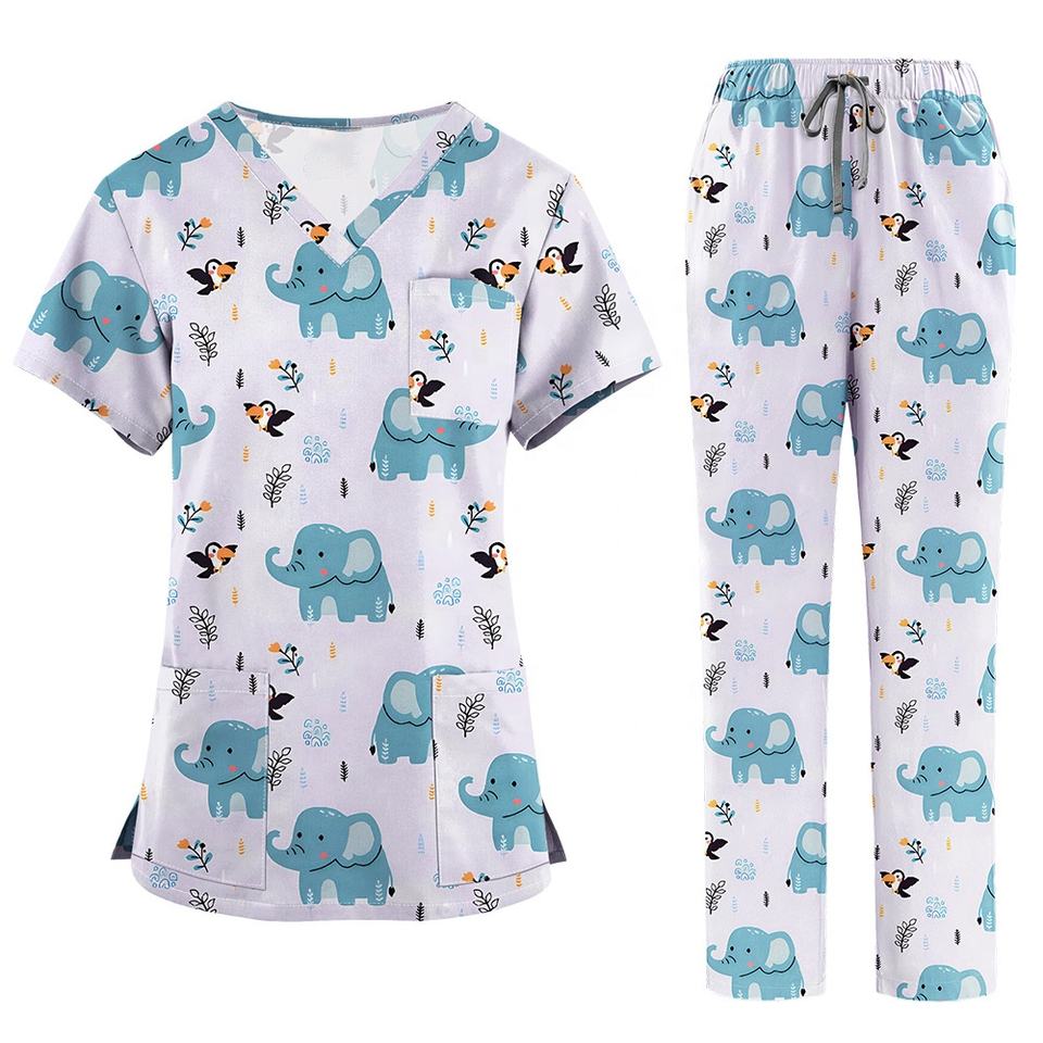 Ensemble d'uniformes d'infirmière imprimés | Haut de travail à col en V et pantalon droit | Vêtements de travail confortables pour le personnel infirmier