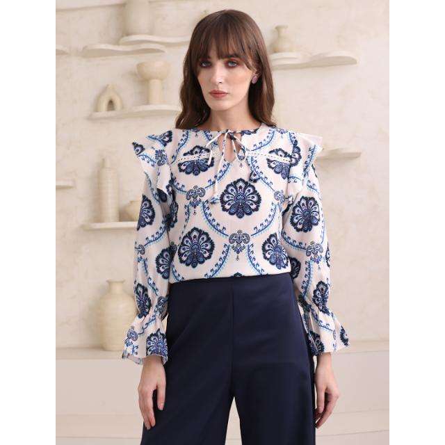 Top Ogee imprimé en coton mélangé Bandhani à manches longues et col rond