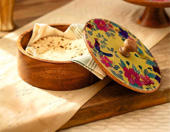 Boîte à chapati en bois arrondie imprimée avec couvercle, résistante à la chaleur et au bois