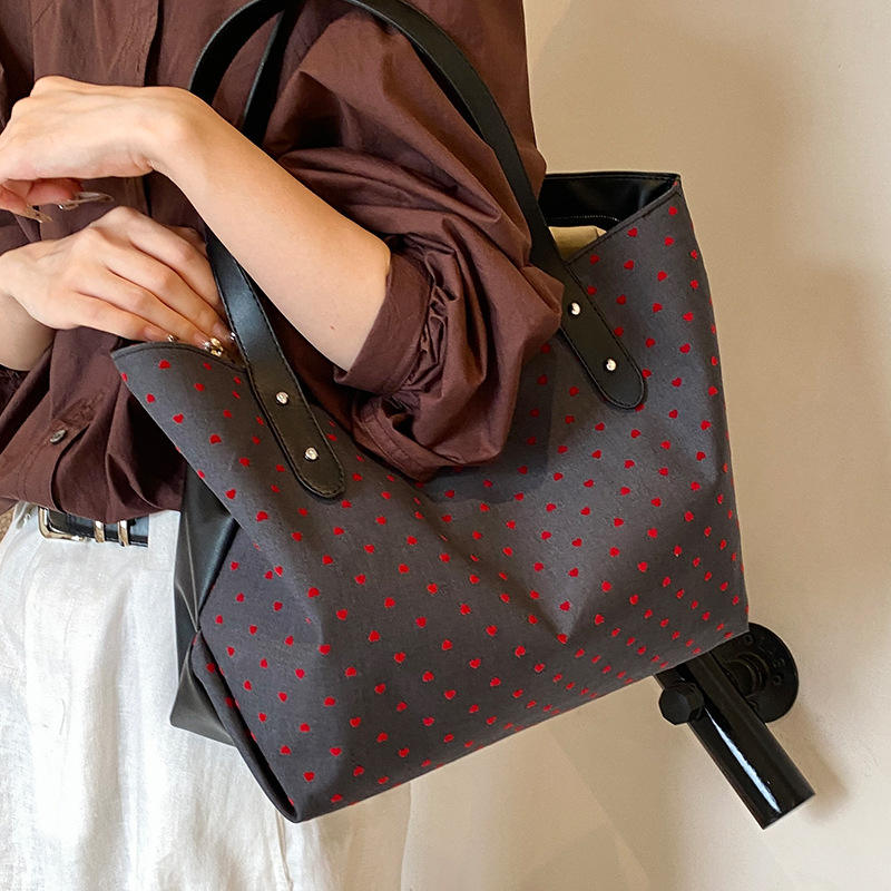Printed denim tote bag Polka dot pattern Leather handle Everyday travel Casual and stylish