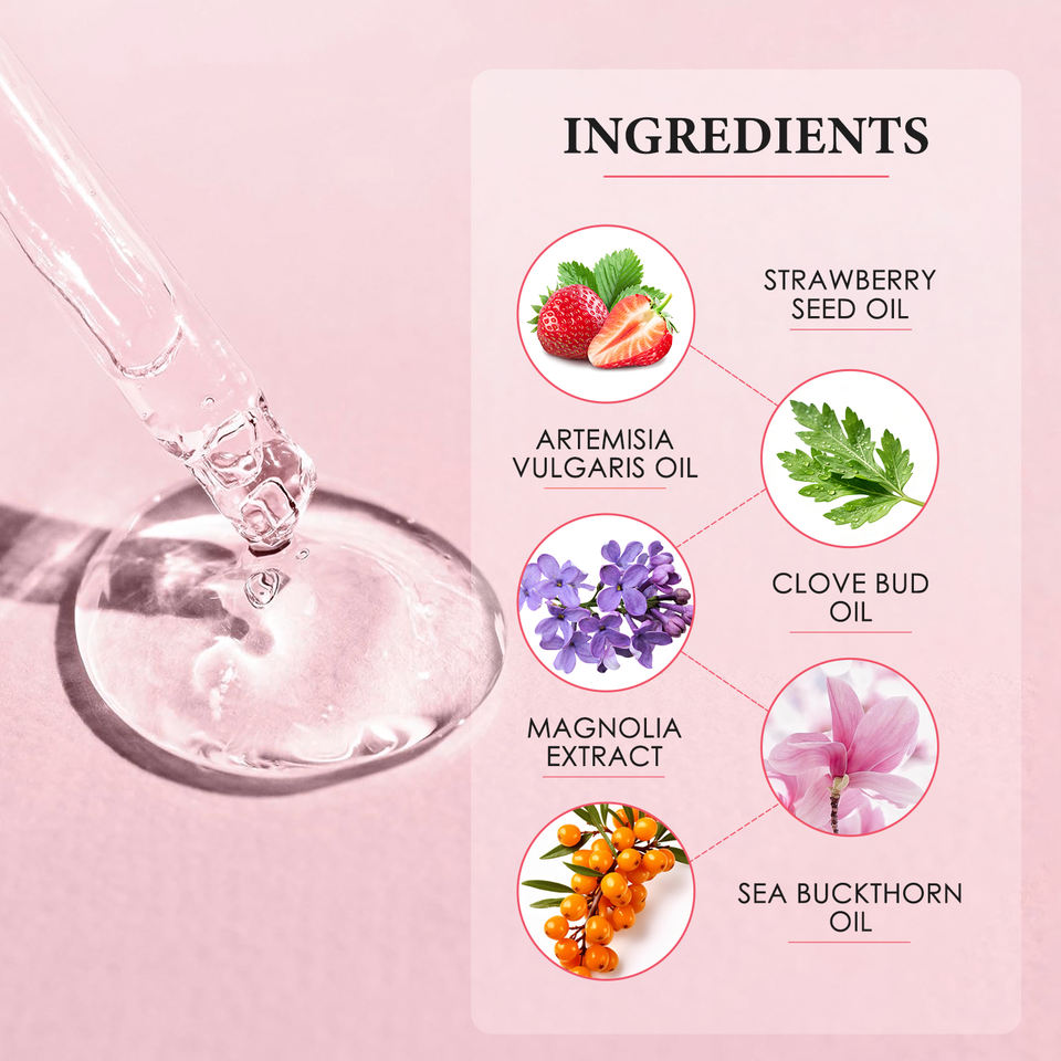 Ingrédients:huile de graines de fraise, huile d'armoise vulgaire, huile de clou de girofle, extrait de magnolia, huile d'argousier