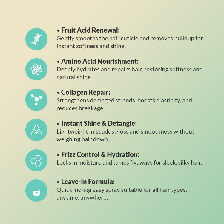 Spray capillaire hydratant et réparateur au collagène et aux acides de fruits 100 ml, marque distributeur, pour cheveux secs au quotidien