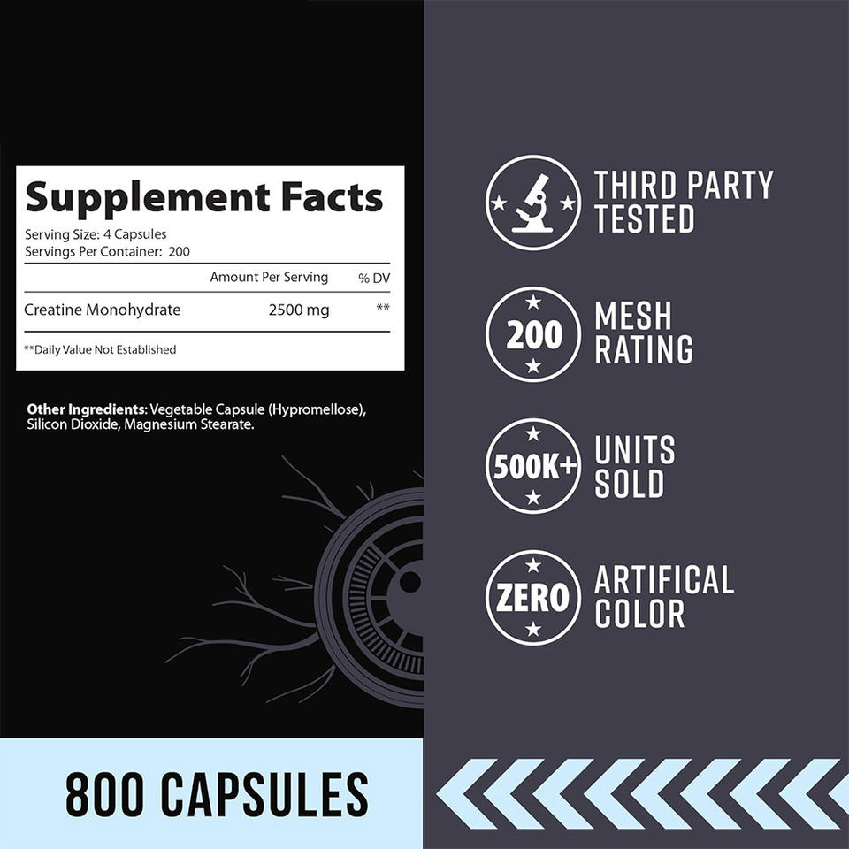 Capsules de créatine monohydratée pure pour adultes en marque privée pour une récupération musculaire plus rapide, force, puissance, aliment santé naturel faible en glucides