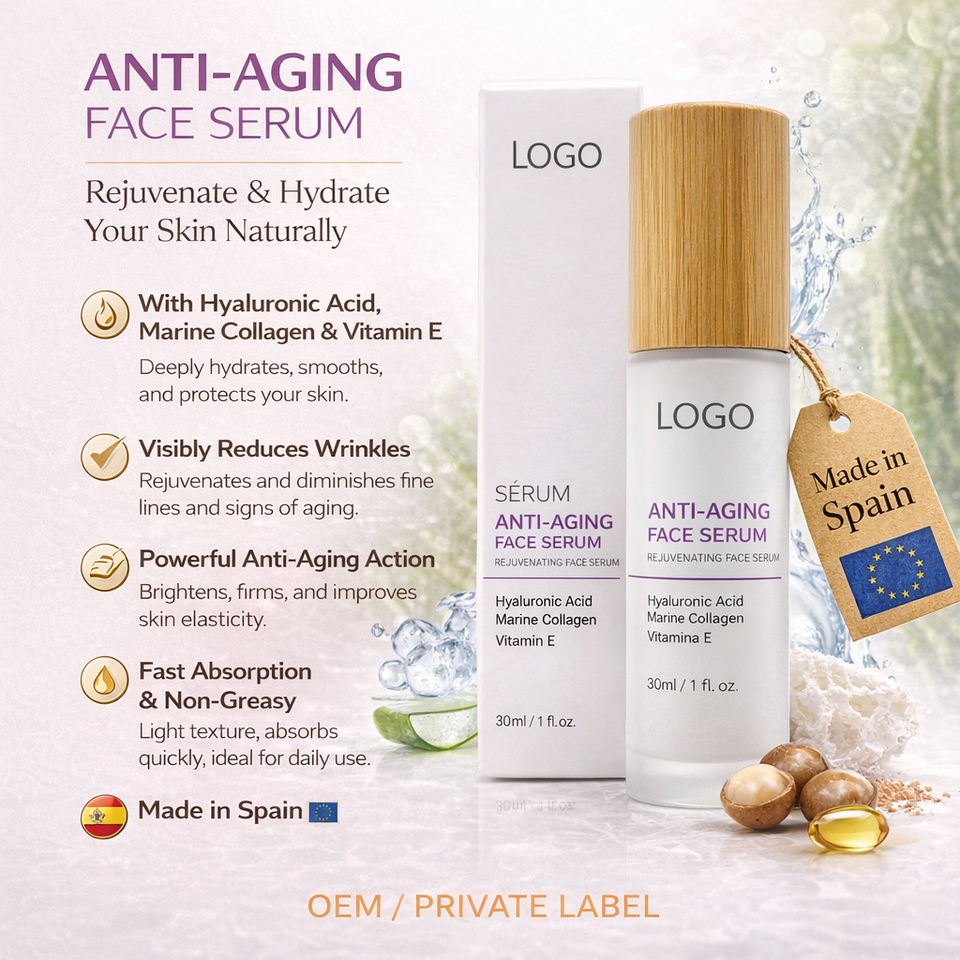 Sérum visage raffermissant anti-âge en marque propre 30ml OEM | Acide hyaluronique, collagène marin, vitamine E | Naturel | Bouteille en verre | Fabriqué