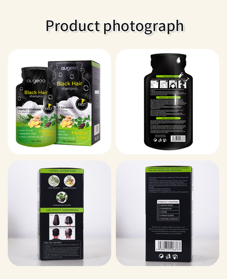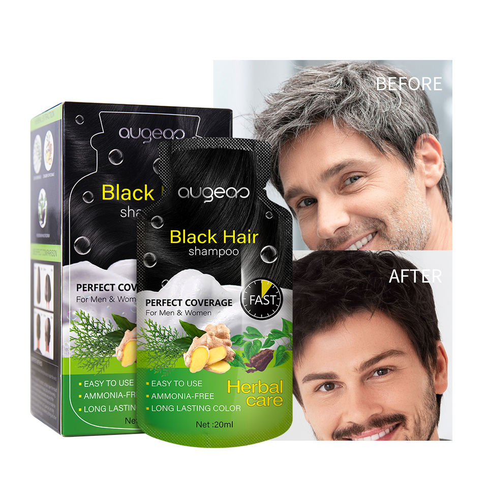 Private Label Augeas ammonia free 3 in 1 color dark brown gray white Natural Herbal Permanent Fast black hair dye shampoo sachet