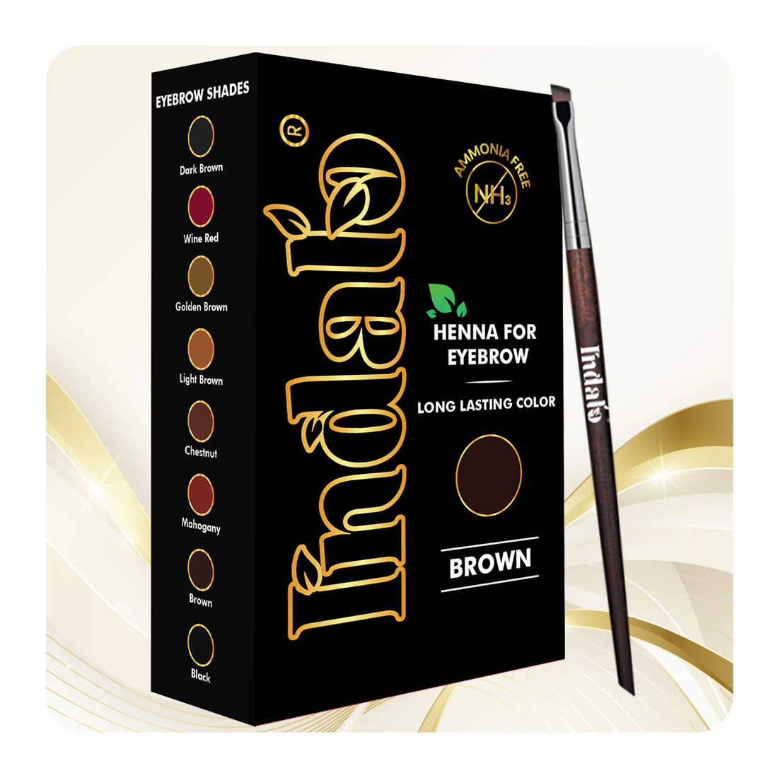 Pochette à fermeture éclair métallique en aluminium de couleur dorée de 10 grammes. Boîte complète de kit de couleur au henné pour sourcils: 2 poches de couleur pour sourcils (10g chacune), huile nourrissante pour sourcils 10ml, brosse à poils pour sourcils, compte-gouttes, bol à mélanger, gants