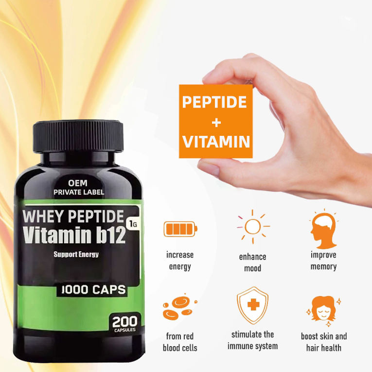 Compléments alimentaires en peptides de protéines de lactosérum clairs de marque privée, vitamines B12 méthylcobalamine 5000 mcg, capsules organiques pour adultes sans OGM