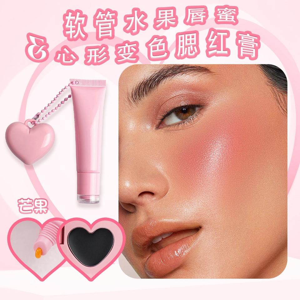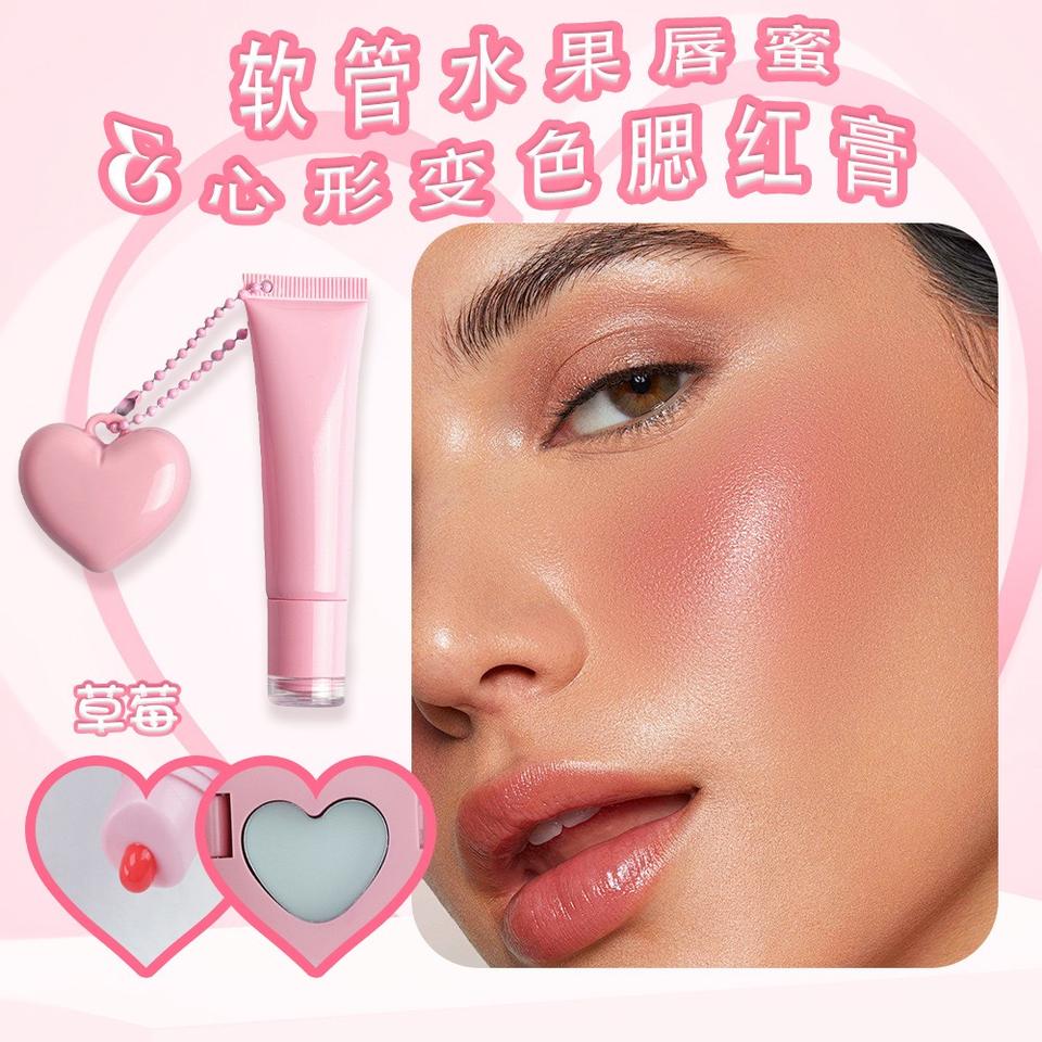 Maquillage en marque privée sans cruauté animale : Fard à joues 2 couleurs en forme de cœur + brillant à lèvres rose doux