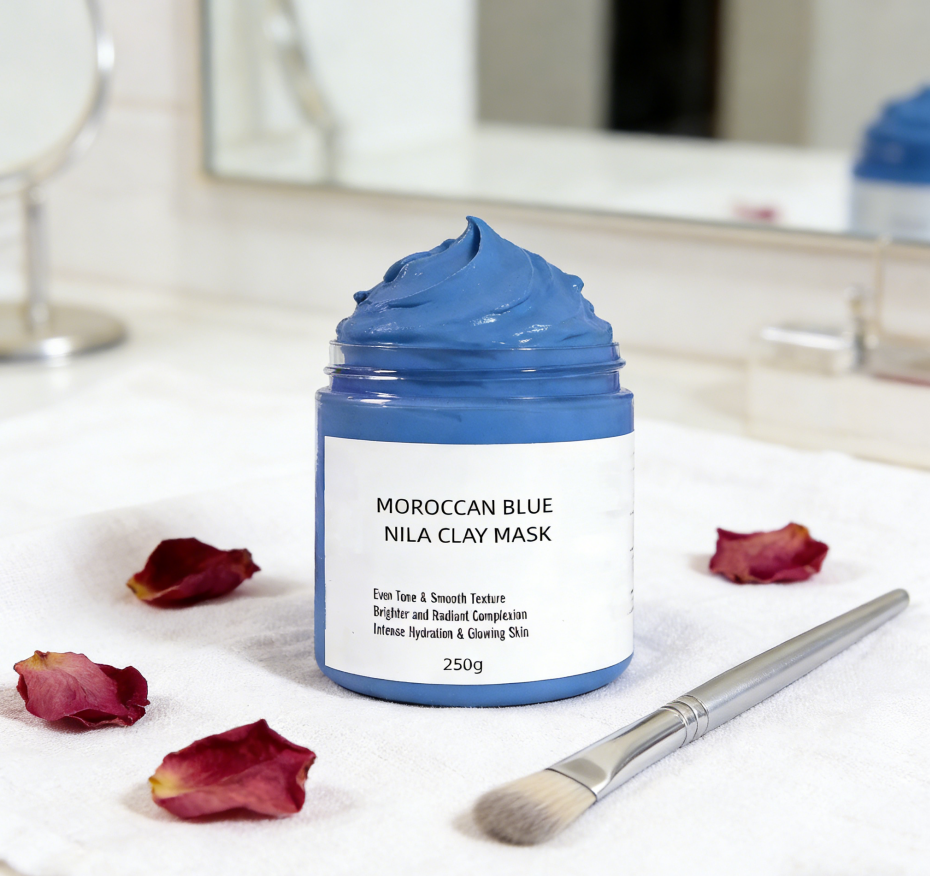 Masque facial en argile de boue nettoyant en profondeur et éclaircissant, marque privée, blanchissant naturel, hydratant, masque facial en boue bleue marocaine Nila