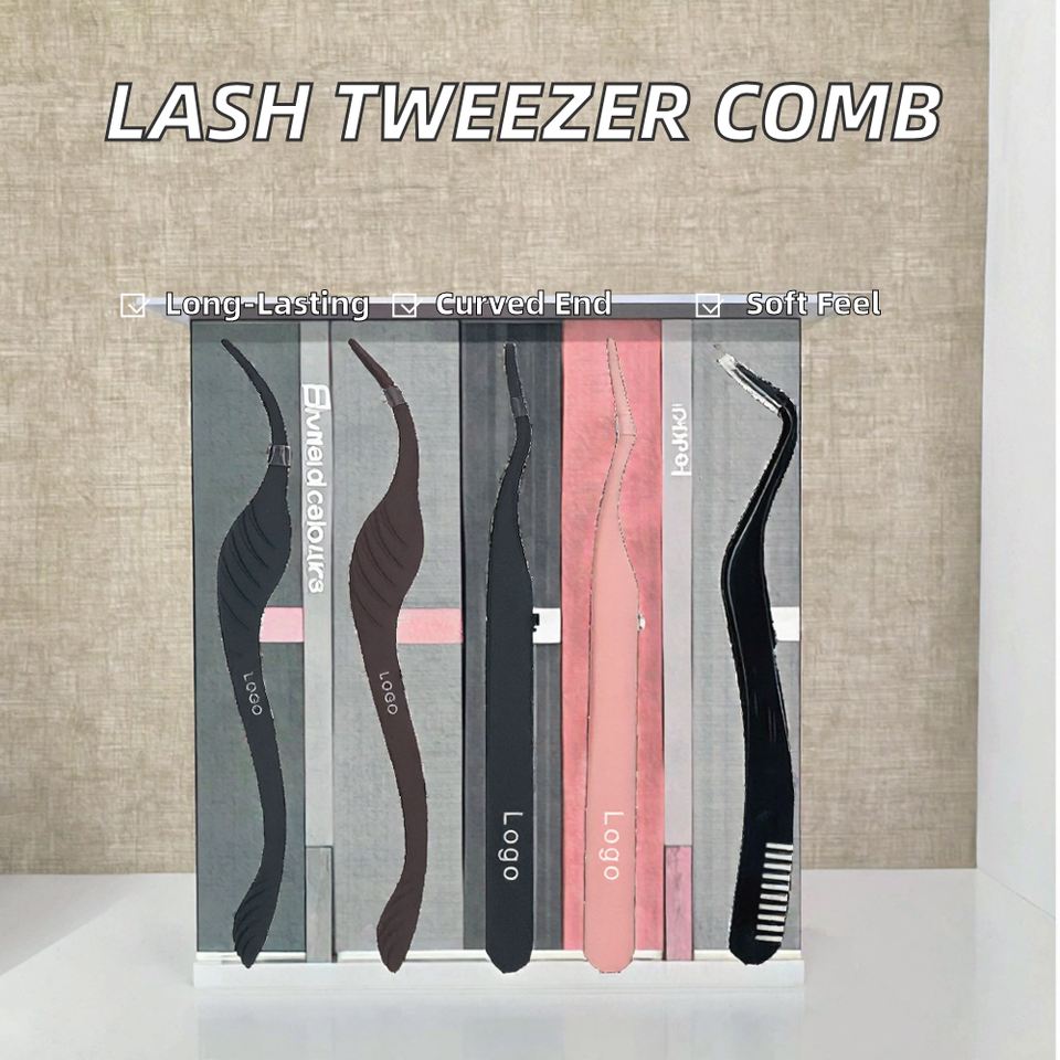 Pince à cils en acier inoxydable durable à pointe incurvée lisse avec peigne, marque privée