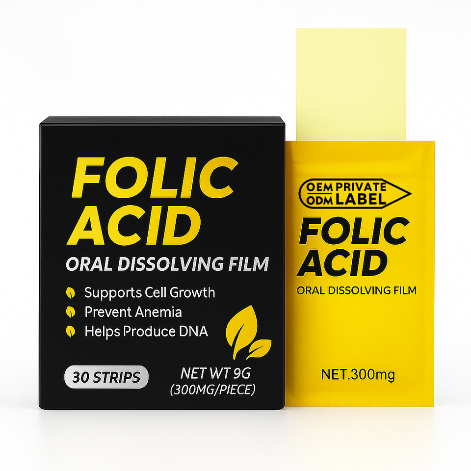 Film oral à dissolution rapide d'acide folique de marque privée, absorption rapide, soutient la croissance cellulaire, prévient l'anémie, aide à la production d'ADN