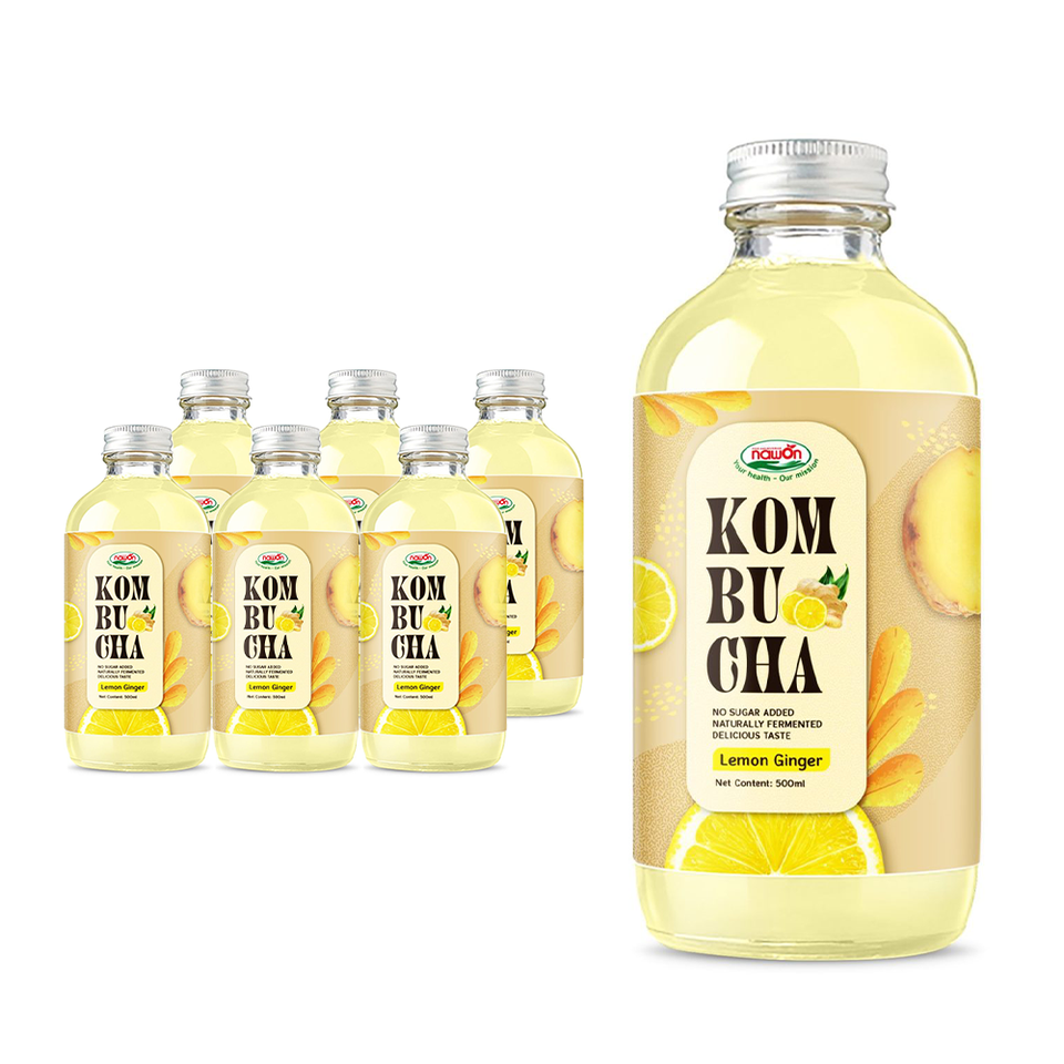 Kombucha Citron Marque Blanche, Boisson Fonctionnelle Prête à Boire, Boisson Saine, Fabricant Partenaire OEM ODM, Gazeuse, Bouteille en Verre 500ml
