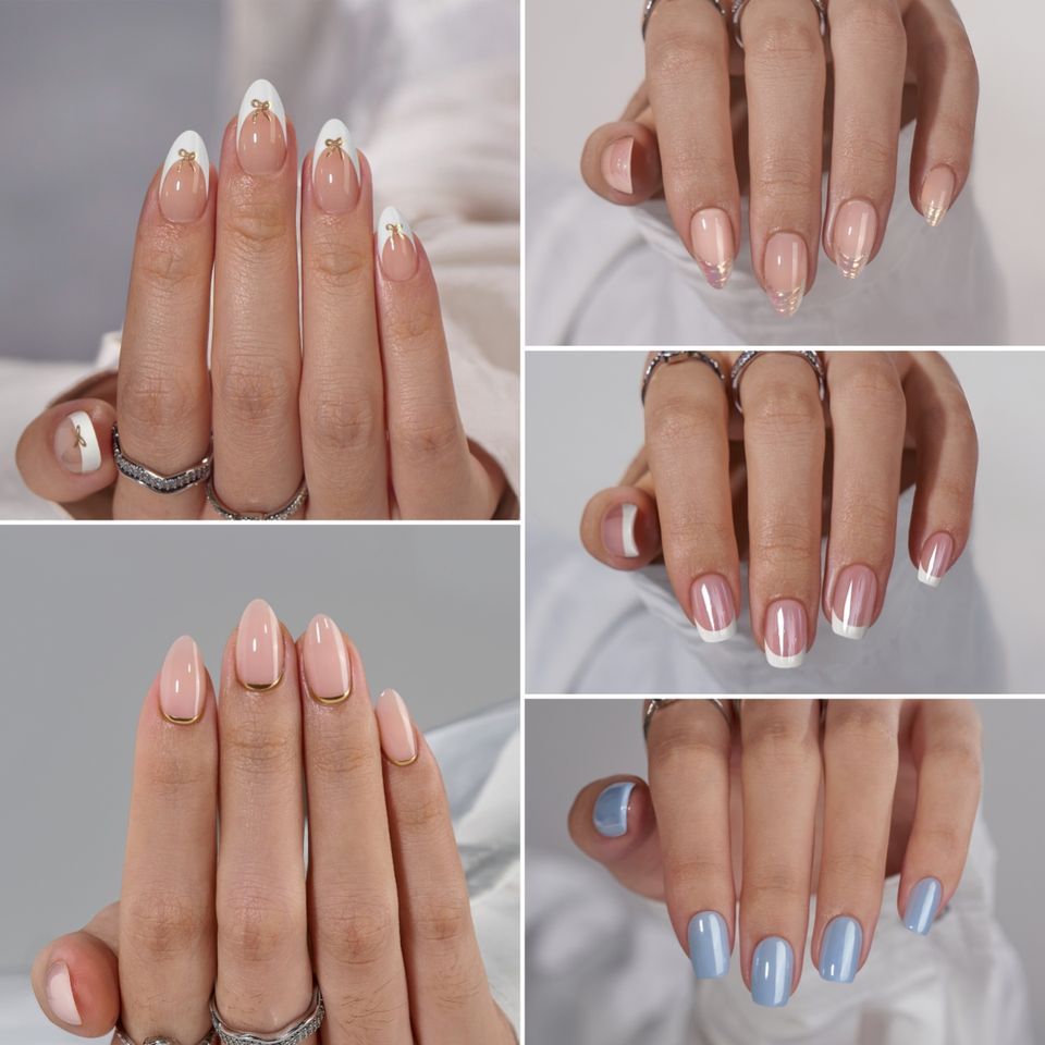 Ongles en gel de luxe à marque privée, forme amande courte, design de créateur, à presser, vente en gros, haute qualité, gel souple, pointe française, ongles à presser