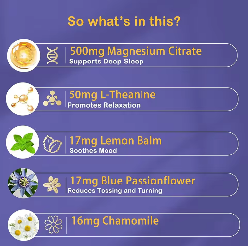 Ingrédient principal:Magnesium Citrate, L-Theanine, Lemon Balm, Blue Passionflower, Chamomile