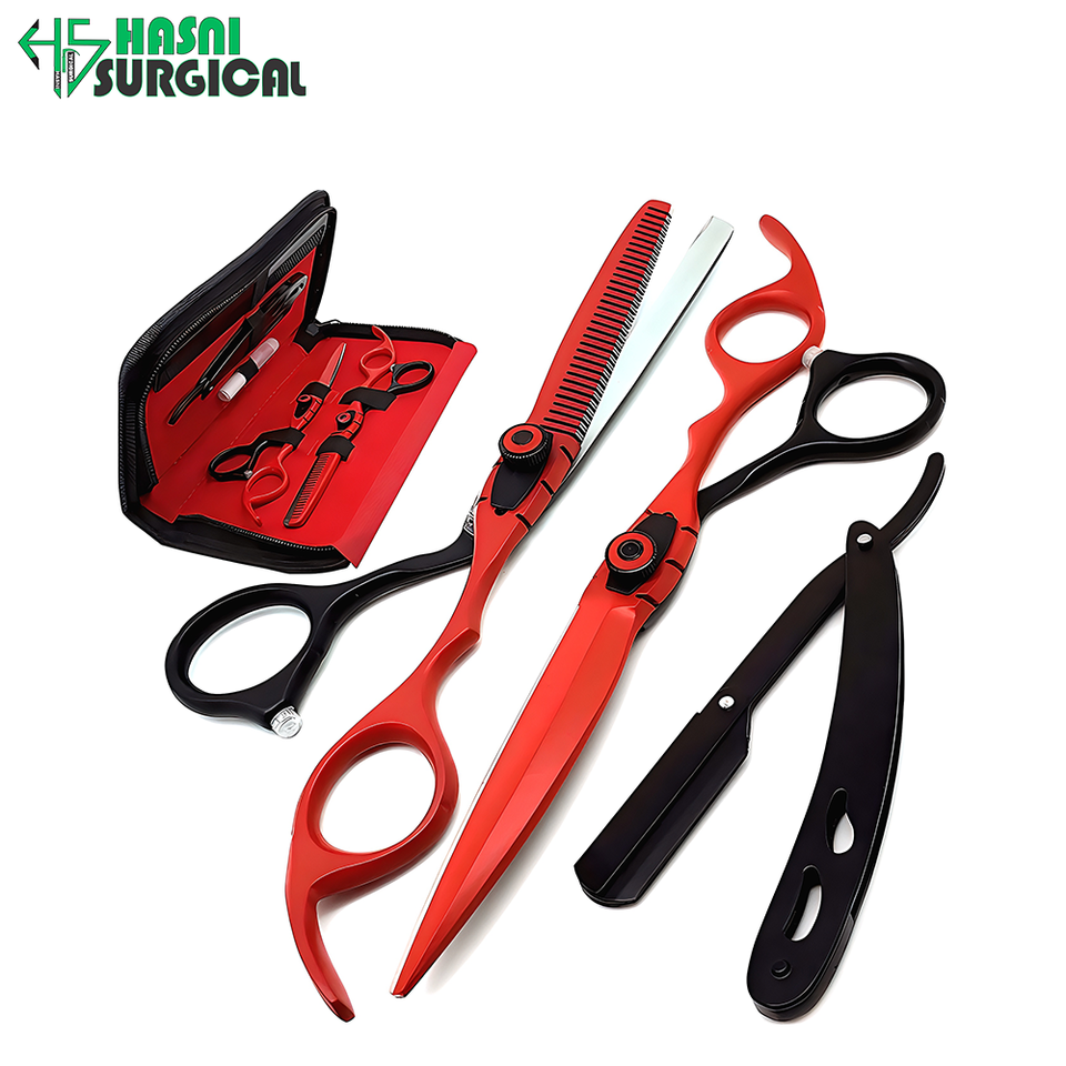 Fournisseur d'instruments médicaux en marque blanche, kit de ciseaux de coiffure et de coupe de cheveux avec rasoir droit