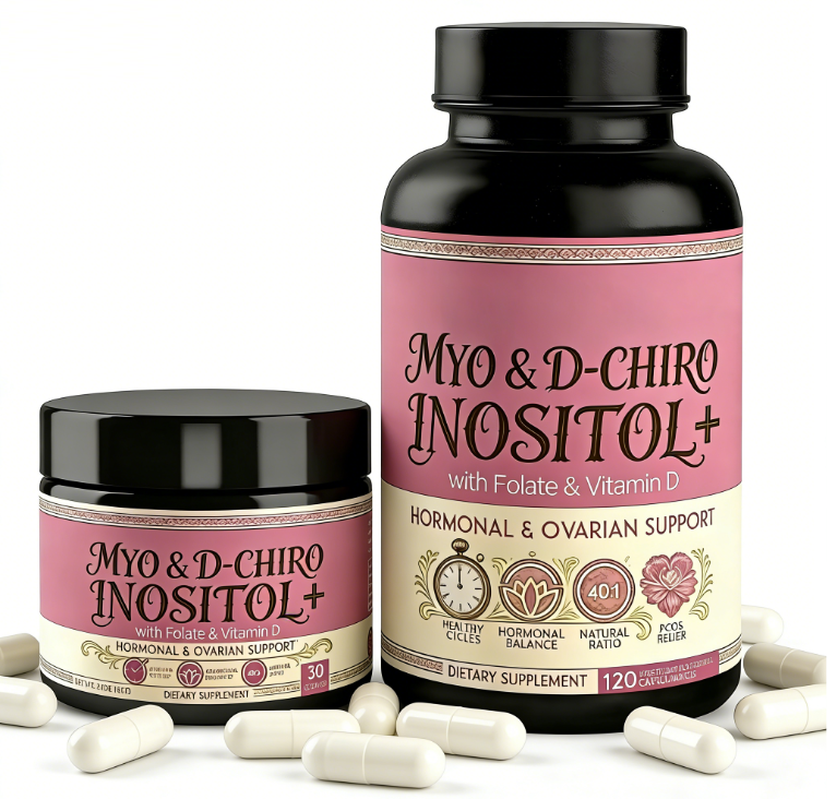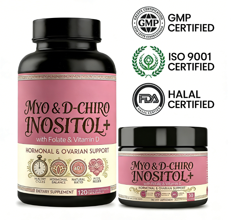 Capsules de Myo-Inositol et D-Chiro-Inositol à Marque Blanche avec Folate et Vitamine D | Complément alimentaire pour le soutien hormonal et ovarien, OEM ODM