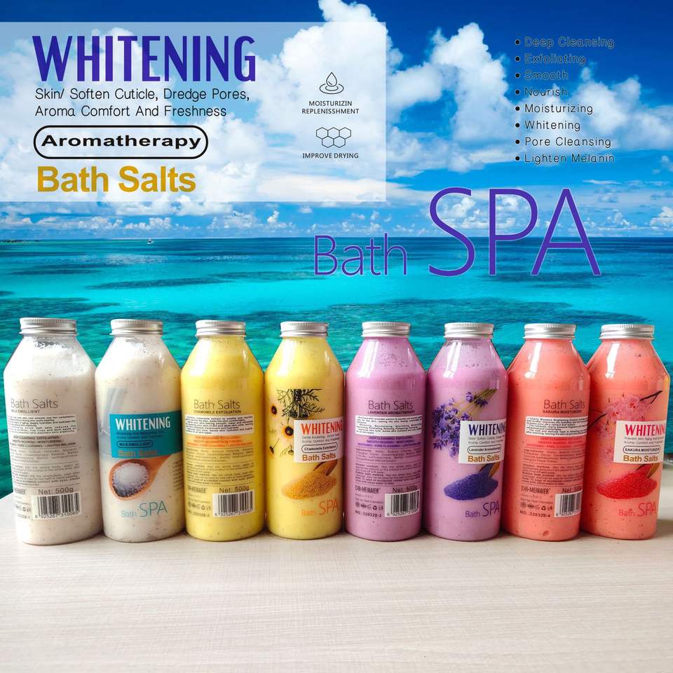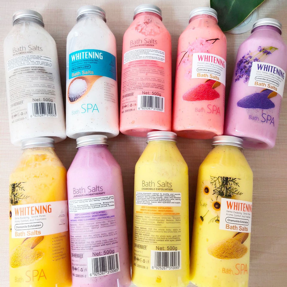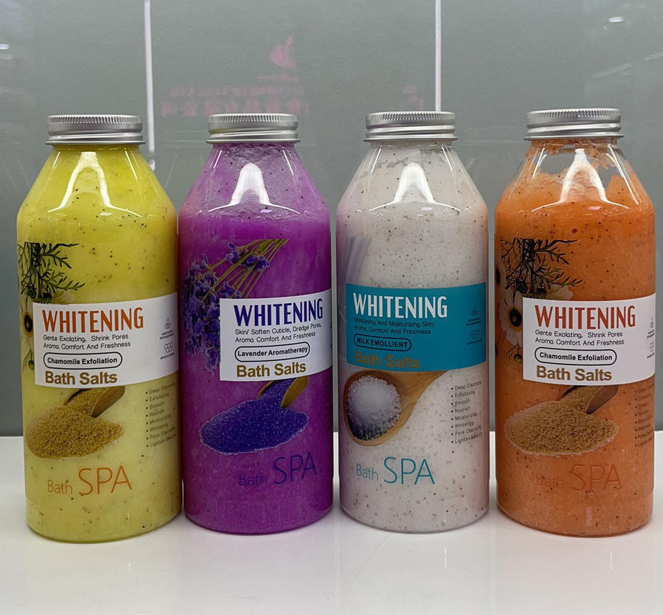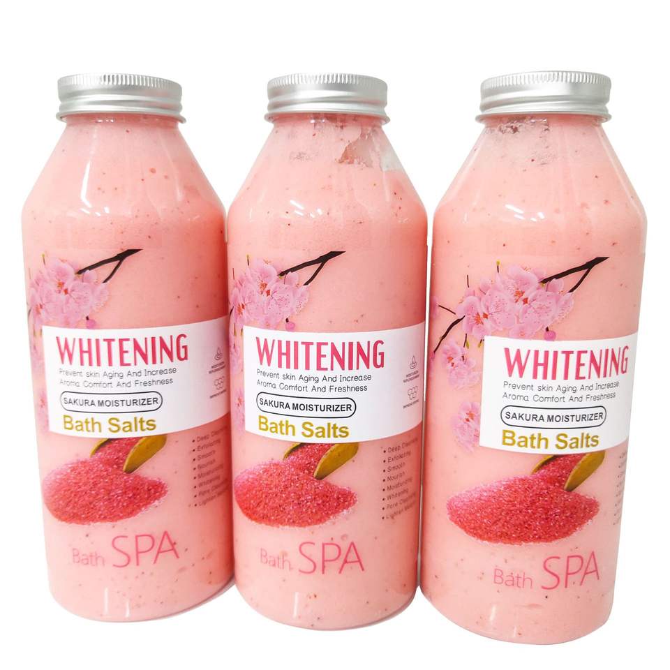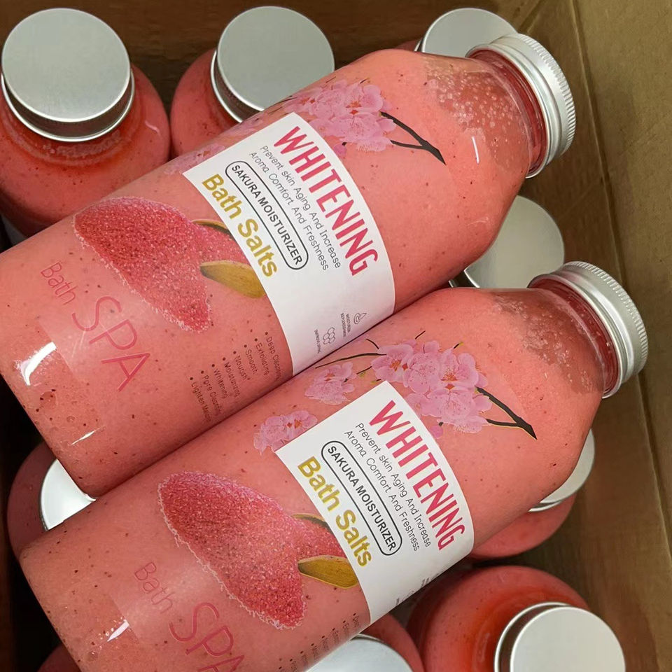 Sels de bain naturels en marque privée, gel douche au lait, gommage au sel, bulles de bain, parfum de fleur de cerisier, nettoyage doux, 500g de sel de bain pour le corps