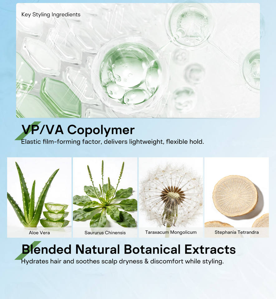 Sans alcool, Sans cruauté, Tous les Ingrédients Naturels, Tenue forte, Formule légère, Longue durée, Haute efficacité, Essais sans cruauté/sans animaux, Séchage rapide, Contient une Protection Solaire, Volume, Texture & Soin des cheveuxDispositif