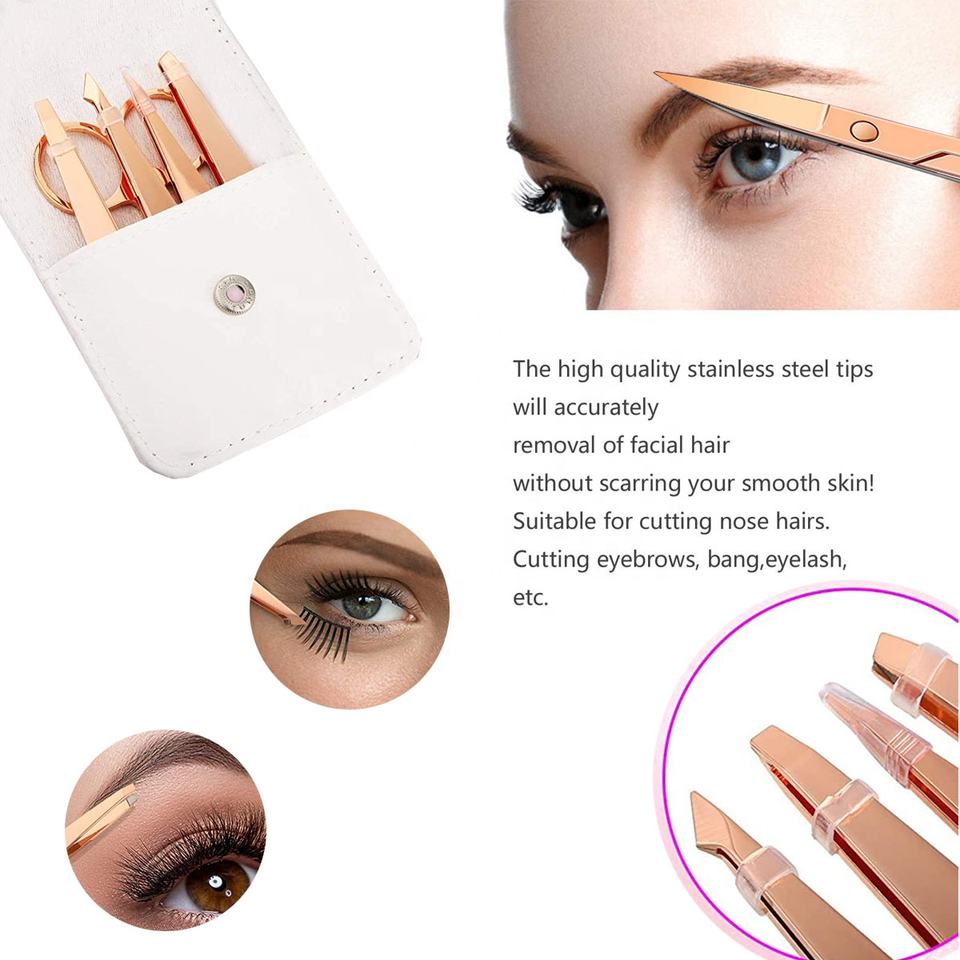 Private Label Professional Customized Stainless Steel Rose Gold Manual Lash Extensions Trimmer Scissors 4pcs Eyebrow Tweezer Set