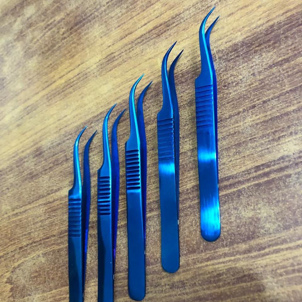 Pince à épiler d'extension de cils en acier inoxydable semi-incurvée professionnelle légère bleu plasma de marque privée