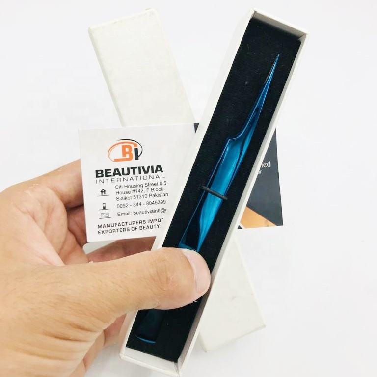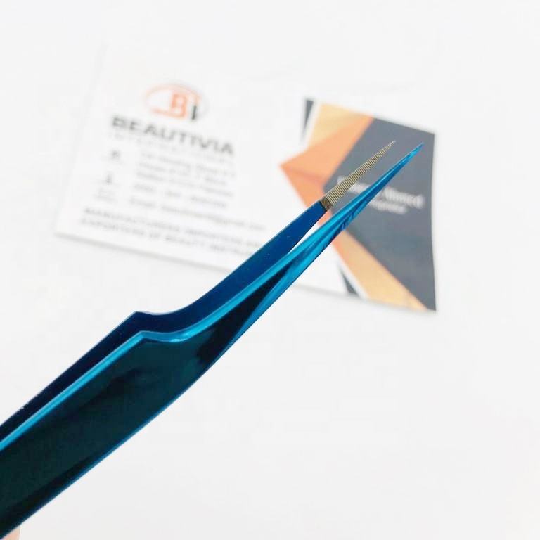 Pince à épiler d'extension de cils en acier inoxydable de marque privée pointe en fibre de plasma bleue durable solide et pointue