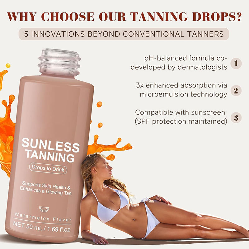 Accélérateur de bronzage en gouttes pour marque privée : Boissons qui favorisent la mélanine, antioxydant, rehaussent l'éclat naturel pour un bronzage quotidien.