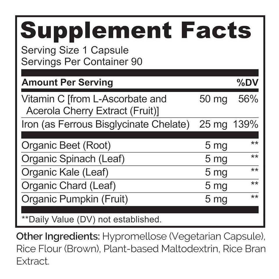 50 mg Vitamin C from L-Ascorbate andAcerola Cherry Extract (Fruit), 25 mg lron (as Ferrous Bisglycinate Chelate), 5 mg Organic Beet (Root), 5 mg Organic Spinach(Leaf), 5 mg Organic Kale (Leaf), 5 mg Organic Chard (Leaf), 5 mg Organic Pumpkin (Fruit)