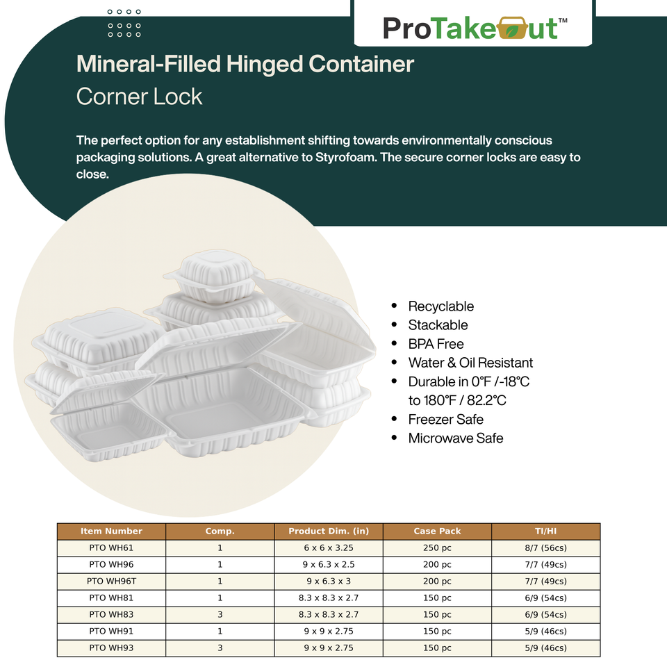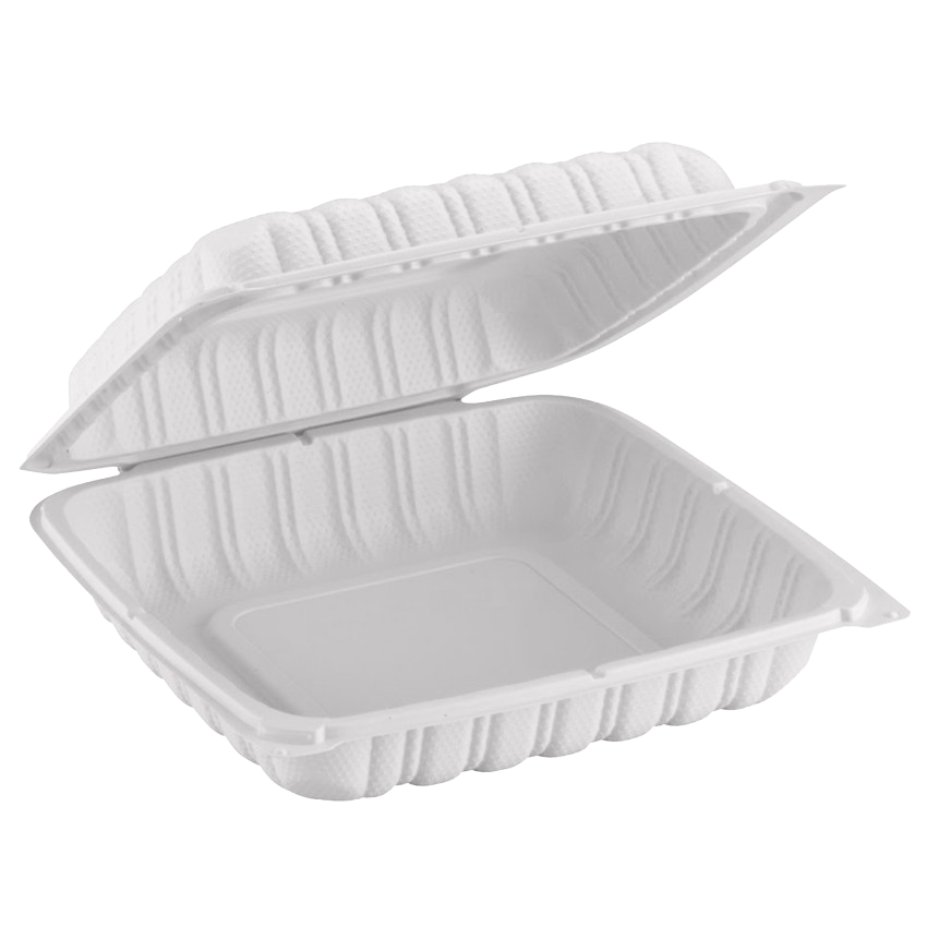 Contenants à emporter ProTakeOut 8,3x8,3 Blancs, lot de 150, durables, compatibles micro-ondes, en plastique, avec fermeture à clapet pour usage en restauration