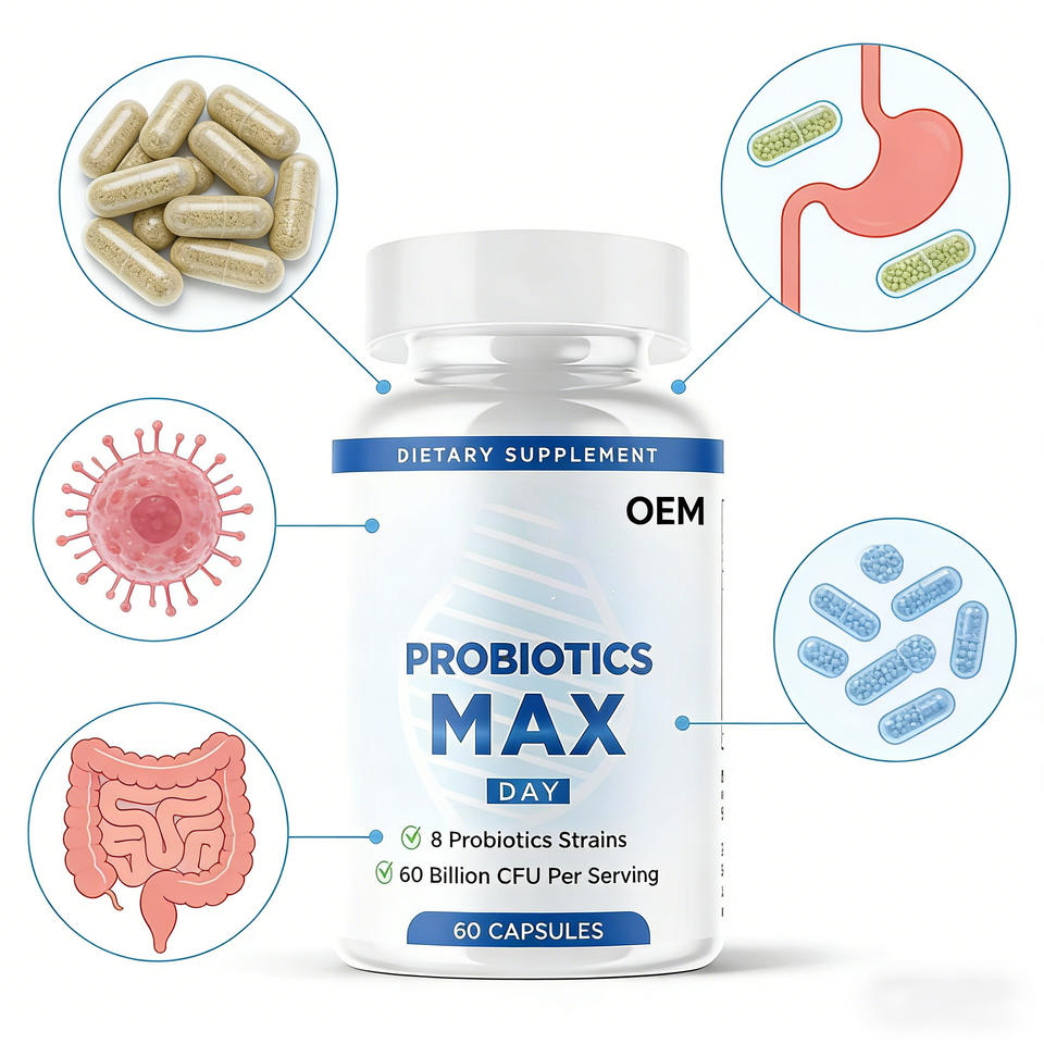 Probiotiques Max 8 Souches 60 Milliards UFC Capsules Soutien Immunitaire Intestinal Fabricant OEM Personnalisé 60 Comprimés Marque Privée