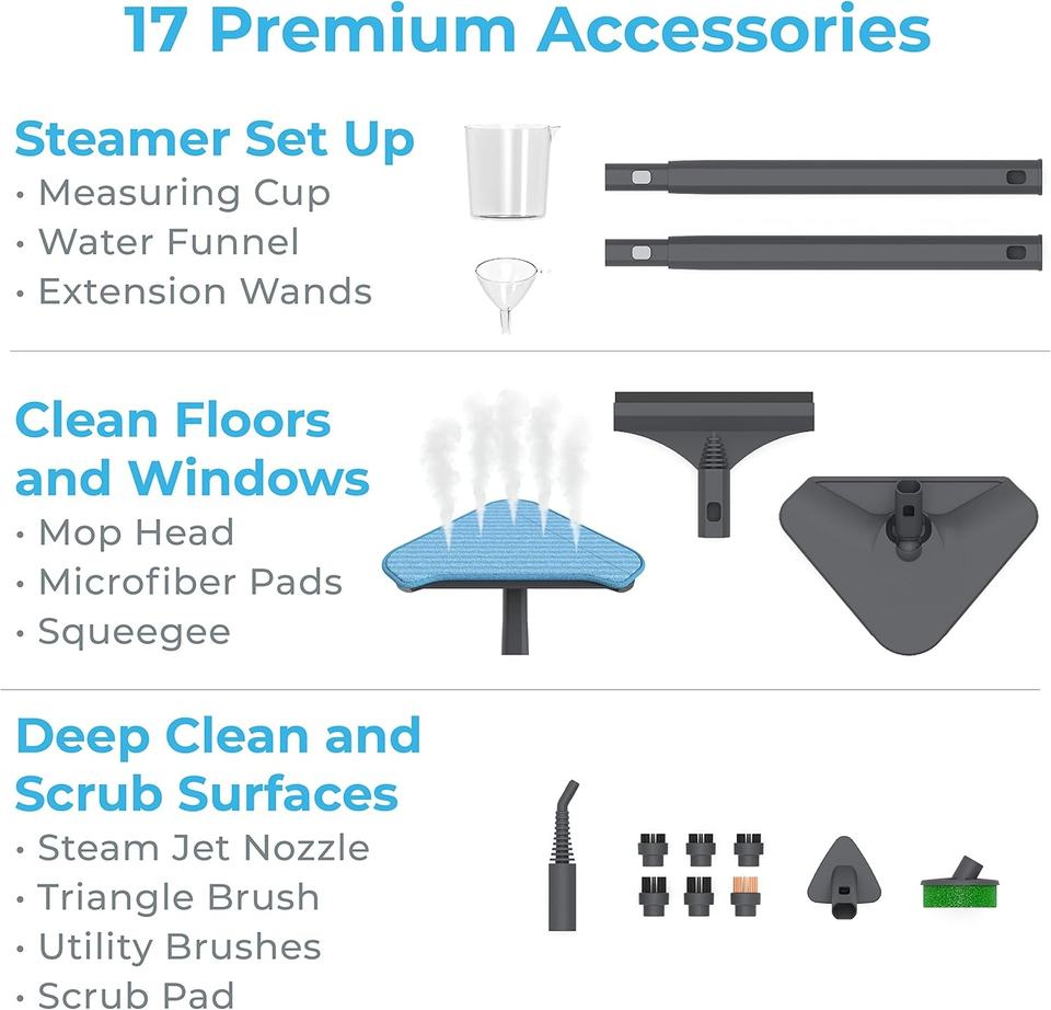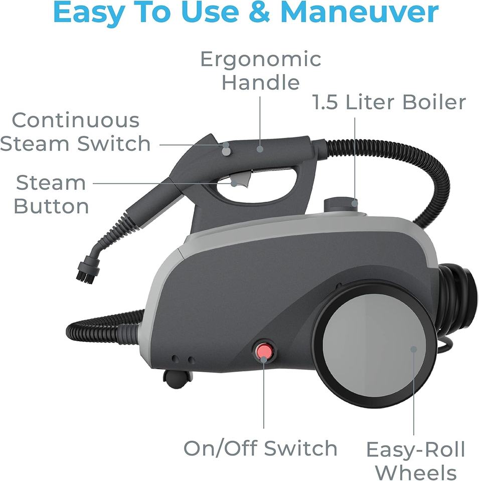 Nettoyeur vapeur professionnel 1500W avec 19 outils pour un nettoyage complet des tapis, des sols, des fenêtres et des voitures