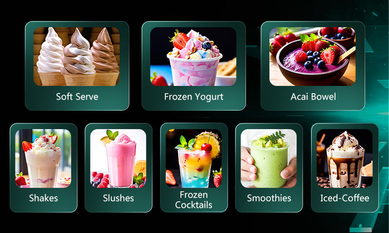Lait, Fruits, Eau, De soja, Légumes, Poudre de crème glacée, Chocolat, Le mélange laitier, Crème glacée sirop, Yogourt