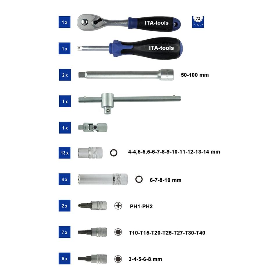 Prise de bit, Barre d'extension, Poignée à cliquet, Socket, Deep Socket, Universal Joint, Sliding T-Handle, Spinner HandleOutil Comprend