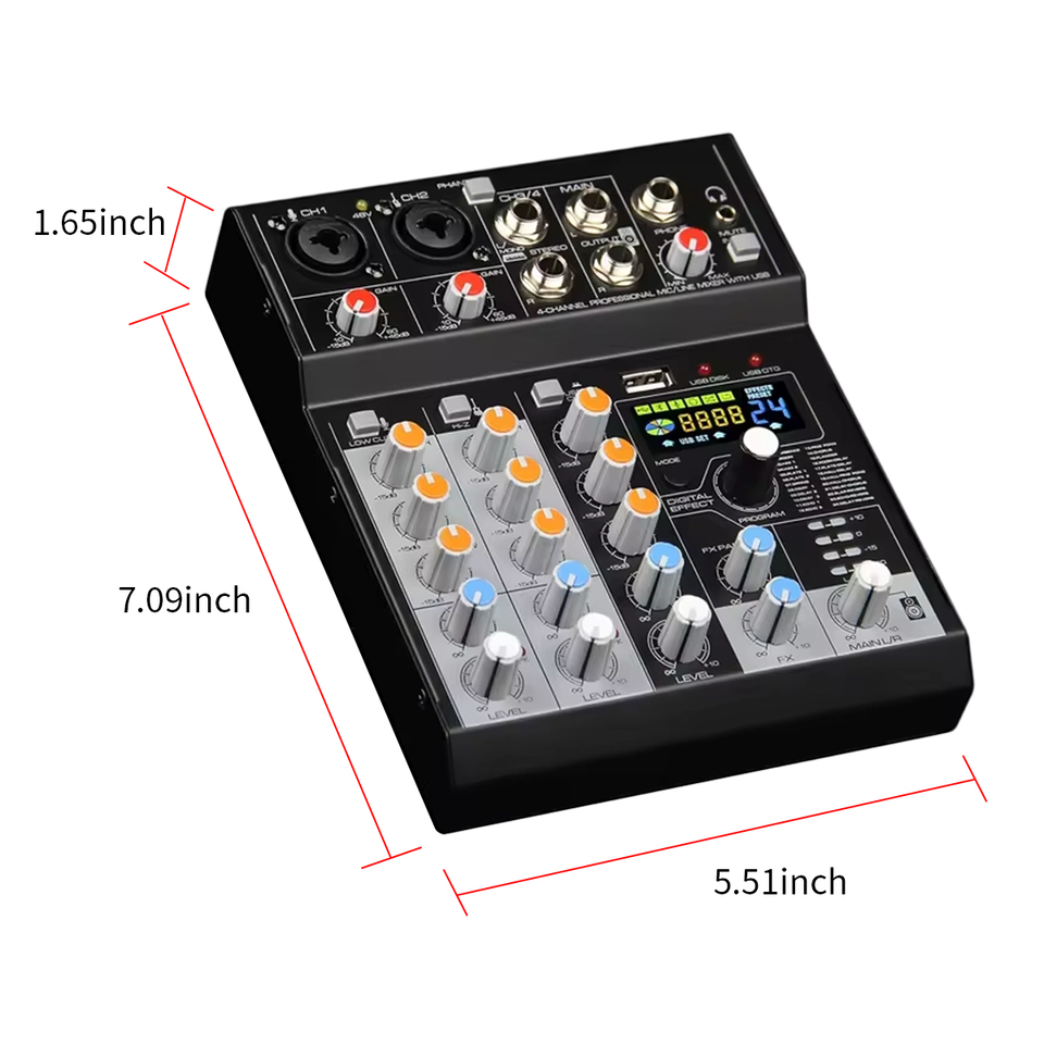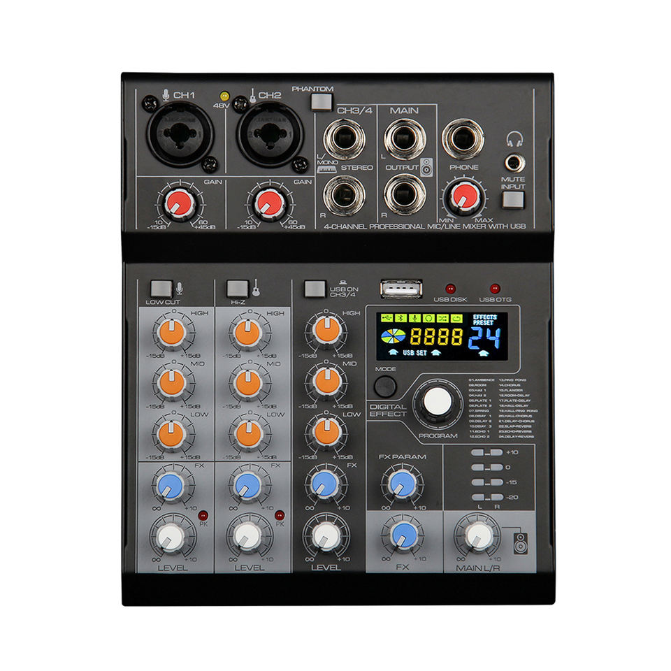 Contrôleur DJ professionnel 4 canaux et console de mixage audio avec construction en métal et plastique, compatible MP3 alimenté