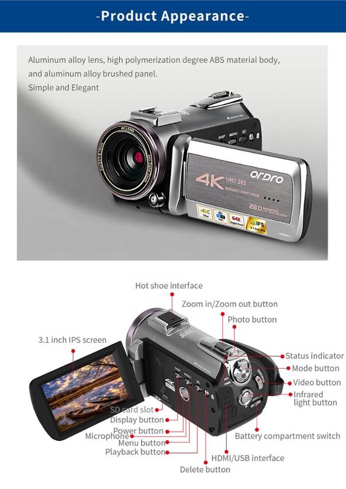 Caméra vidéo professionnelle 4k 30FPS Caméscope de vision nocturne Stéréo Caméra numérique 4k Ordro AZ50