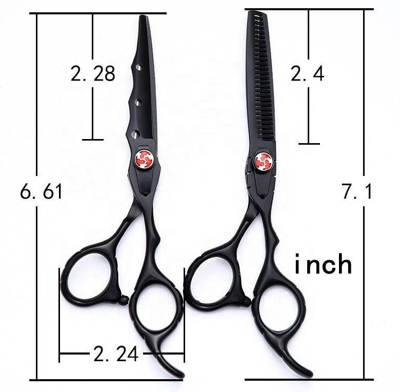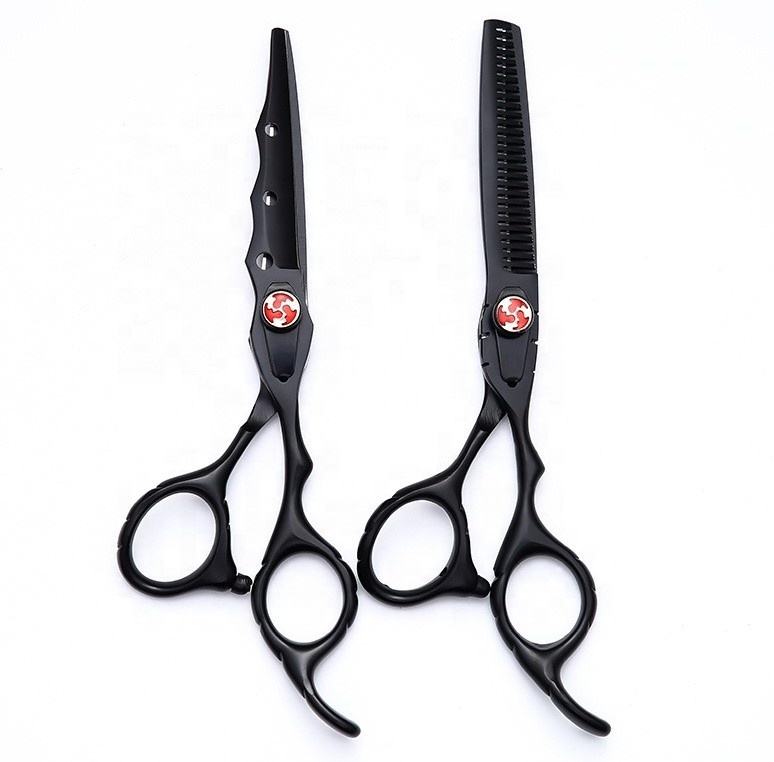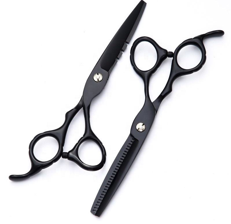 Ciseaux professionnels de coupe de cheveux de barbier en acier inoxydable noir de 6 pouces Logo personnalisé ciseaux amincissants outil de beauté à pointe de lame tranchante