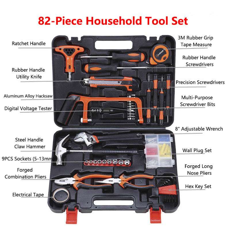 Marteau, Tournevis, mètre ruban, Pinces, Pinces combinées, Couteau utilitaire, Ruban isolant, Des morceaux, Ciseaux, Clé à molette, Ensemble de vis et de quincaillerie, Clés Allen, Jeu de douilles, Poignée de bit, Ensemble de bits, Pinces à épiler, Testeur de tension numériqueOutil Comprend