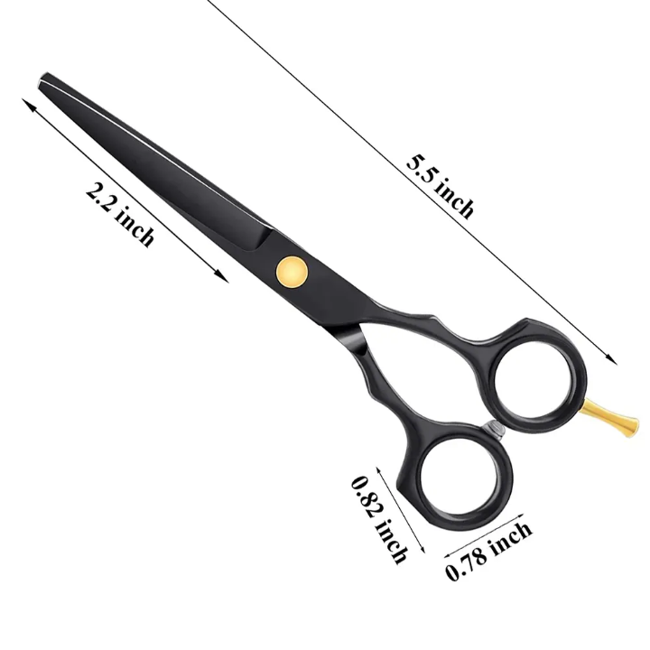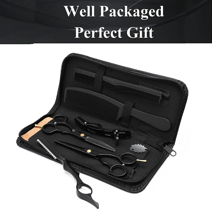 Kit de coiffure professionnel pour barbier, rasoir droit, ciseaux à effiler, ciseaux de coupe, peigne, ensemble en acier inoxydable noir.
