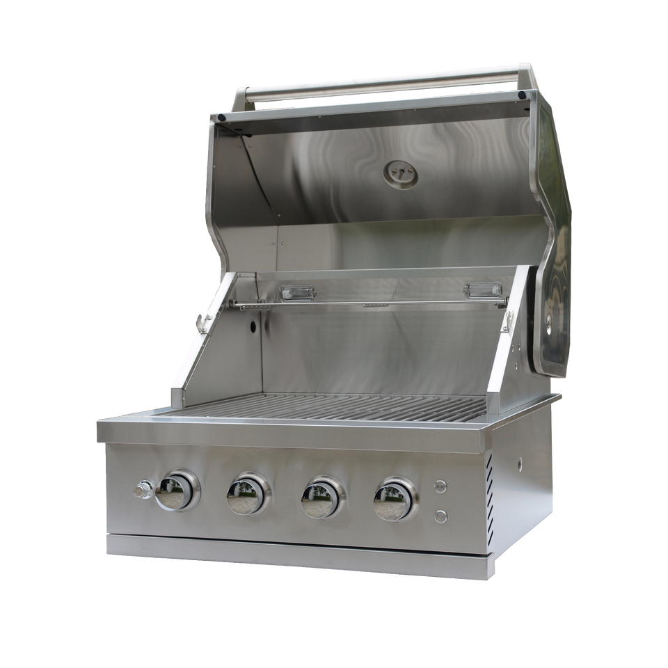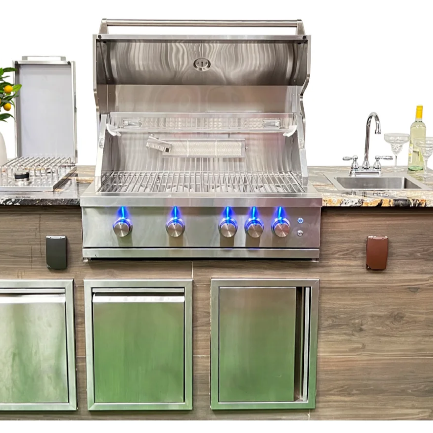 Fabrication professionnelle de barbecue en acier inoxydable intégré à 4 brûleurs barbecue à gaz pour l'extérieur avec LED et rôtisserie