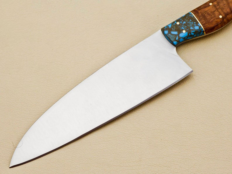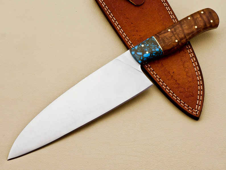 Couteau de chef professionnel en acier inoxydable 440c fait à la main en résine époxy et manche en bois couteau de cuisine avec gaine en cuir pur