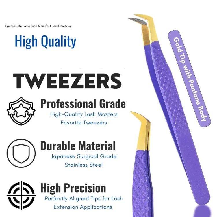Outils de cils personnalisés professionnels pince à épiler à pointe en fibre pour extensions de cils or avec couleur violette et pointe en fibre