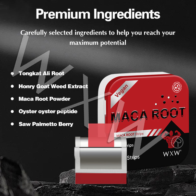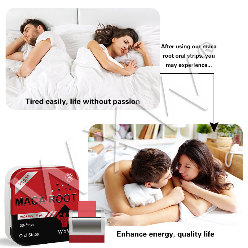 Bandes orales de racine de maca sans sucre naturelles personnalisées professionnelles, complément de maca, film oral, stimulant énergétique, film oral à dissolution rapide