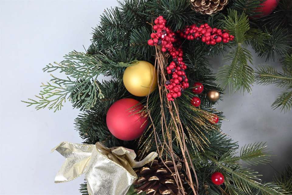 Guirlandes de couronnes de Noël artificielles en PVC de baies rouges personnalisées professionnelles de 30 pouces avec des pommes de pin